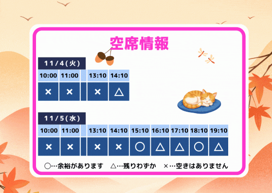 11/4(火)11/5(水)の空席情報をお知らせします