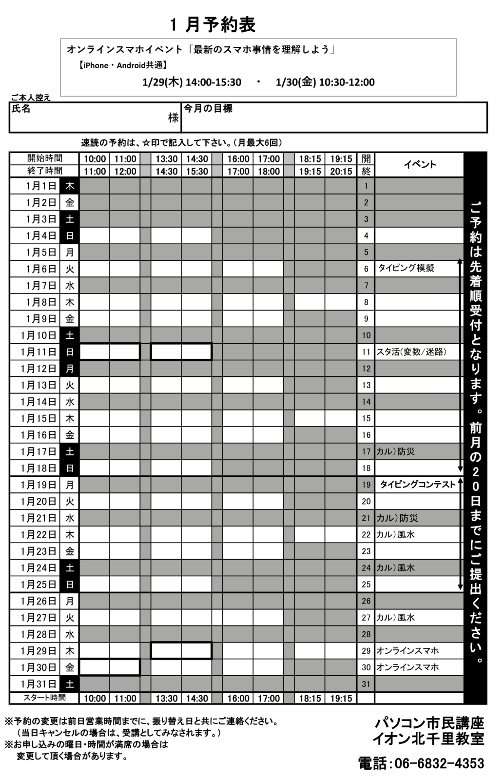 イオン北千里教室から今週の予約状況と1月予約受付開始のご案内です。