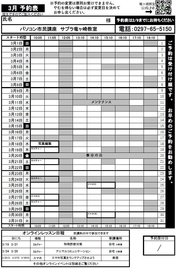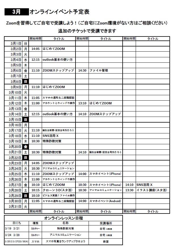 2月、3月の予約表、3月のオンラインイベントをお知らせいたします。