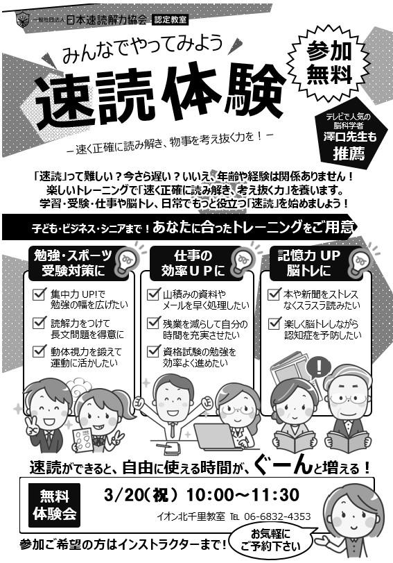 イオン北千里教室から今週の予約状況と3月速読無料体験会のご案内です。