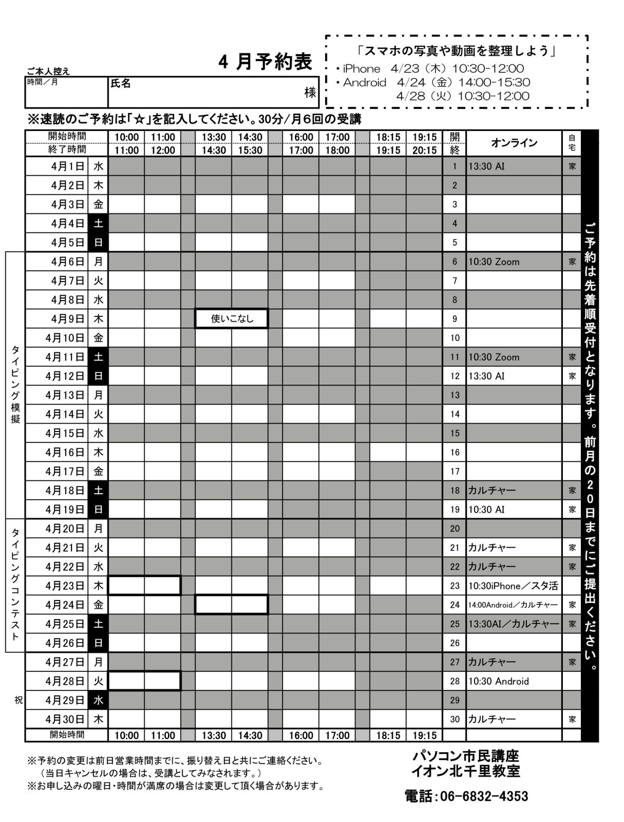 本日より、4月の予約受付を開始しています。