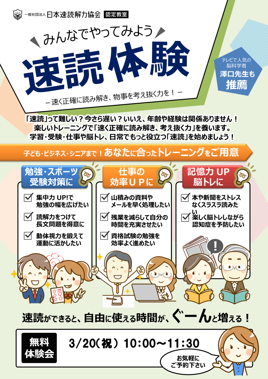 イオン北千里教室から今週の予約状況と3月速読無料体験会のご案内です。