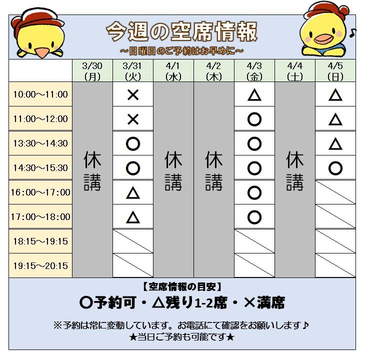 イオン北千里教室から今週の予約状況休講のご案内です。