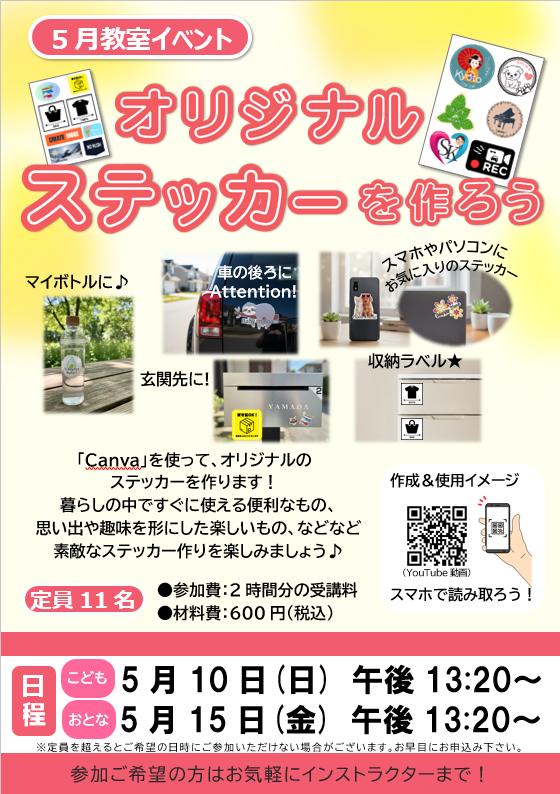 材料費は、おひとり600円 2時間分の受講料が必要となります。