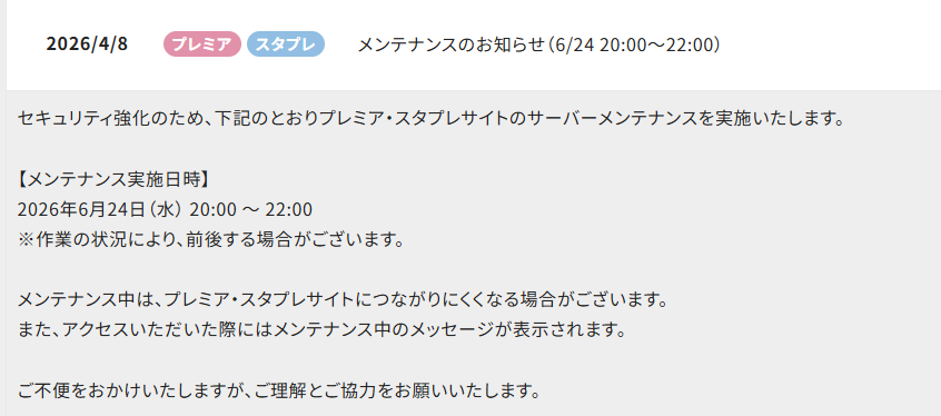 今日は、6月24日(水)に、プレミアサイトのメンテンナンスが、20時から2・3時間の間行われるお知らせがありました。