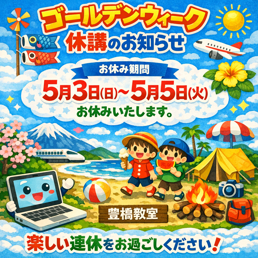 教室は、5月3日(日)から5月5日(火)までがお休みとなります。