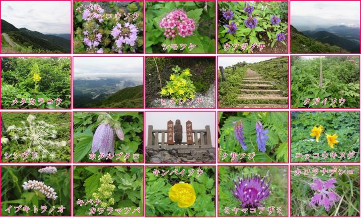 イブキトラノオ、クガイソウ、メタカラコウ、シモツケ、キリンソウ、クサフジなど。